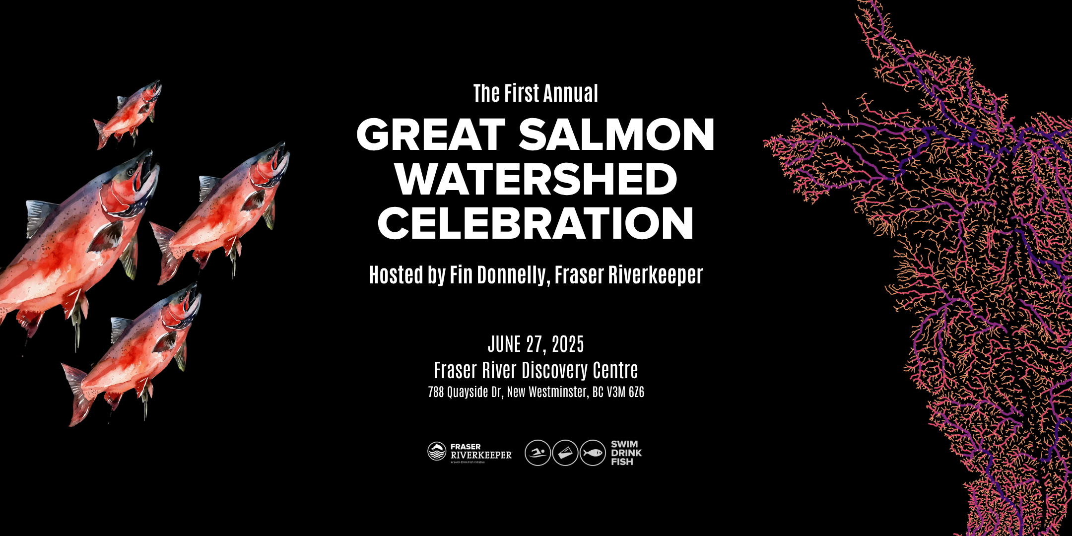 Back to All Events The First Annual Great Salmon Watershed Celebration Friday, June 27, 2025 7:00 p.m. 9:00 p.m. Fraser River Discovery Centre 788 Quayside Drive New Westminster, BC, V3M Canada (map) Google Calendar ICS Buy Tickets on Eventbrite Reserve Your Spot!